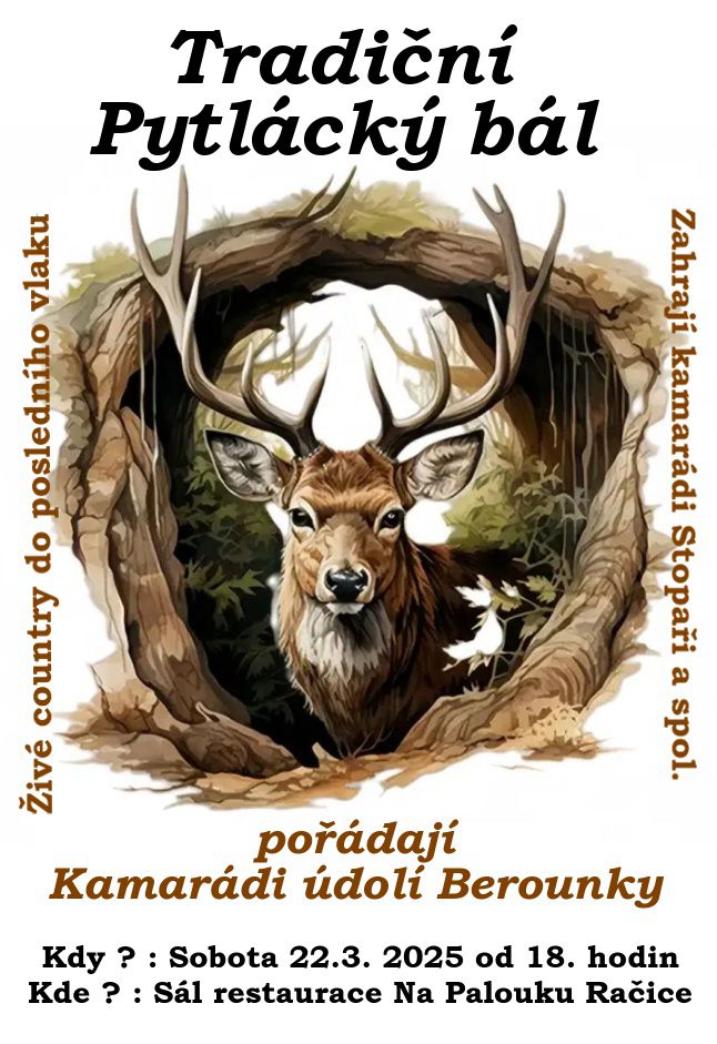 Kamarádi údolí Berounkou Vás srdečně zvou na tradiční Pytlácký bál dne 22.3.2025 od 18:00 hod. v sále restaurace na Palouku v Račicích